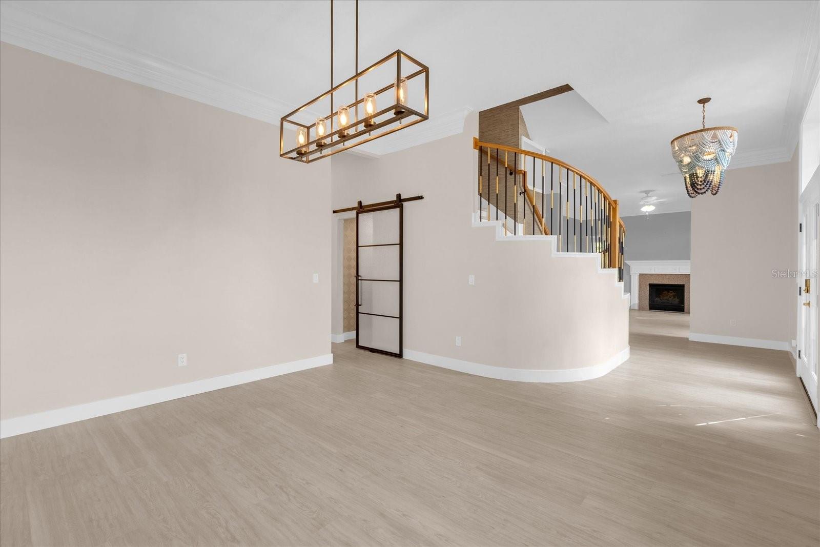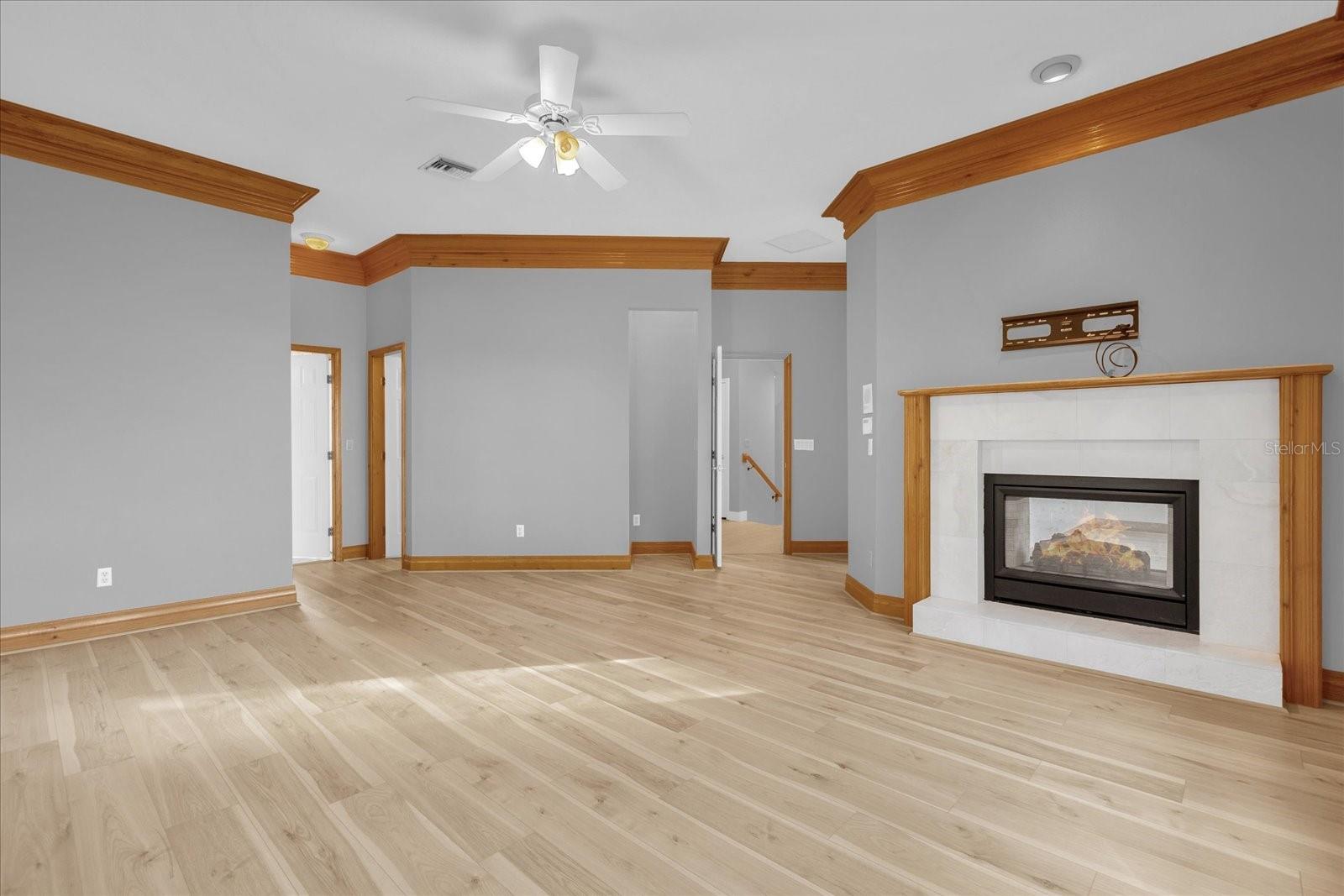 The main floor includes a dining room and family room off the kitchen, as well as a formal living room with a fireplace to the right of the front door. Two staircases lead to the sleeping quarters. The primary bedroom features a double-sided fireplace for both its living room and the bedroom, along with a private balcony where you can watch Disney’s fireworks every night. The newly designed, spacious bathroom features two elegant vanities and a luxurious shower with a built-in bench, complemented by dual shower heads—one a soothing rain head—where you can enjoy breathtaking sunsets over the water. Down the hall, three more bedrooms await, with two being en-suites. One suite faces Lake Minneola, while the other offers a private balcony to watch the sunset over the long canal to Cherry Lake.